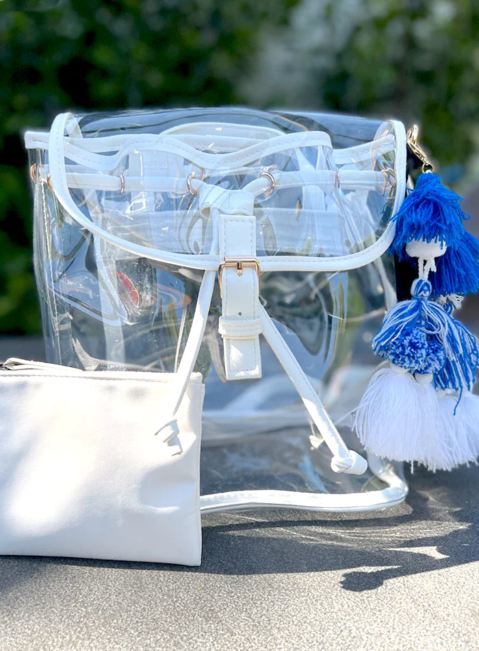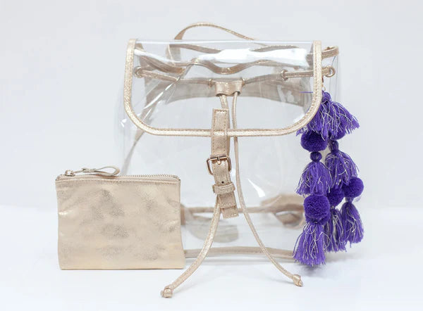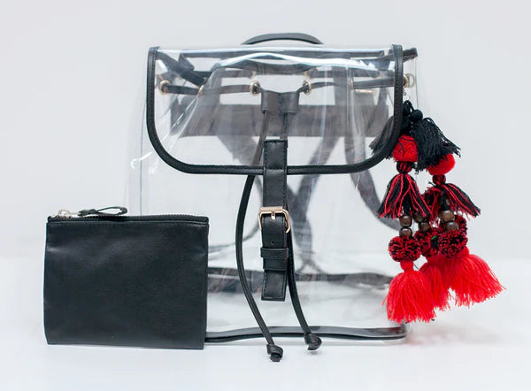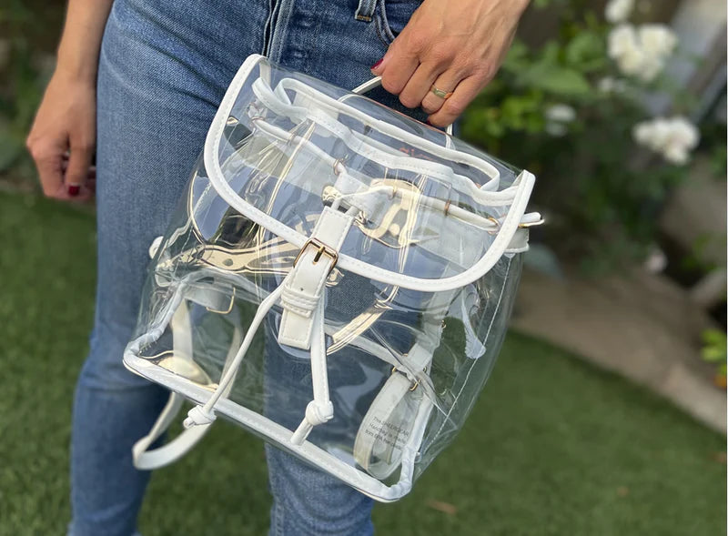 The ELIZABETH BACKPACK is the perfect bag for a hands-free game. Made in our durable PVC plastic and faux leather trim. The Elizabeth features a double adjustable shoulder strap in vegan leather with a pull tie and magnetic closure.