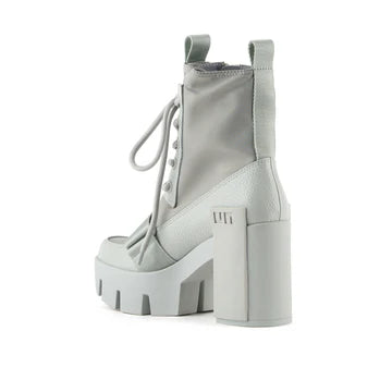 The Grip Combat is a reinterpretation of the classic combat boot with a platform lift, a statement logo block, and a defining log sole. The upper features a mix of durable materials, including tumbled leather, sporty nylon fabric, and nylon webbing, and is equipped with a functional exterior pocket. A lace-up closure, side zipper, and velcro top strap provide a secure fit and effortless on/off wear, while the chunky, cleated platform sole adds significant height and a distinctive, grip-like tread.