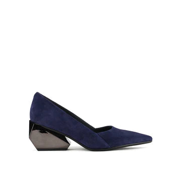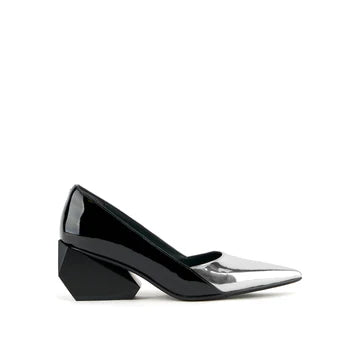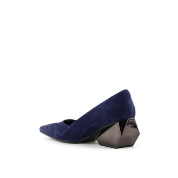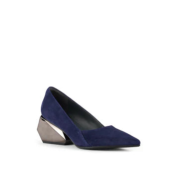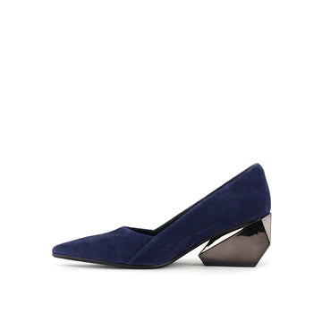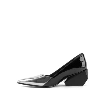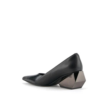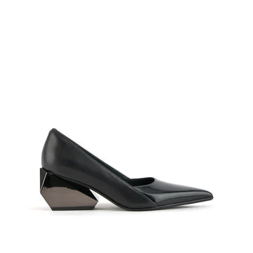 The Ricky Pump Mid offers a sculptural take on a classic silhouette. Featuring a sleek, pointed toe and a refined upper crafted in polished leather and metallics, the Ricky Pump maintains an elegant profile atop a uniquely sculpted, geometric block heel. This multifaceted, architectural heel adds a touch of futuristic flair and elevates these pumps from simple to statement-making.